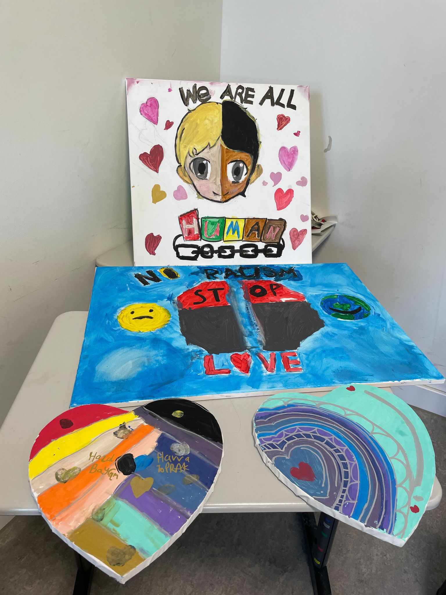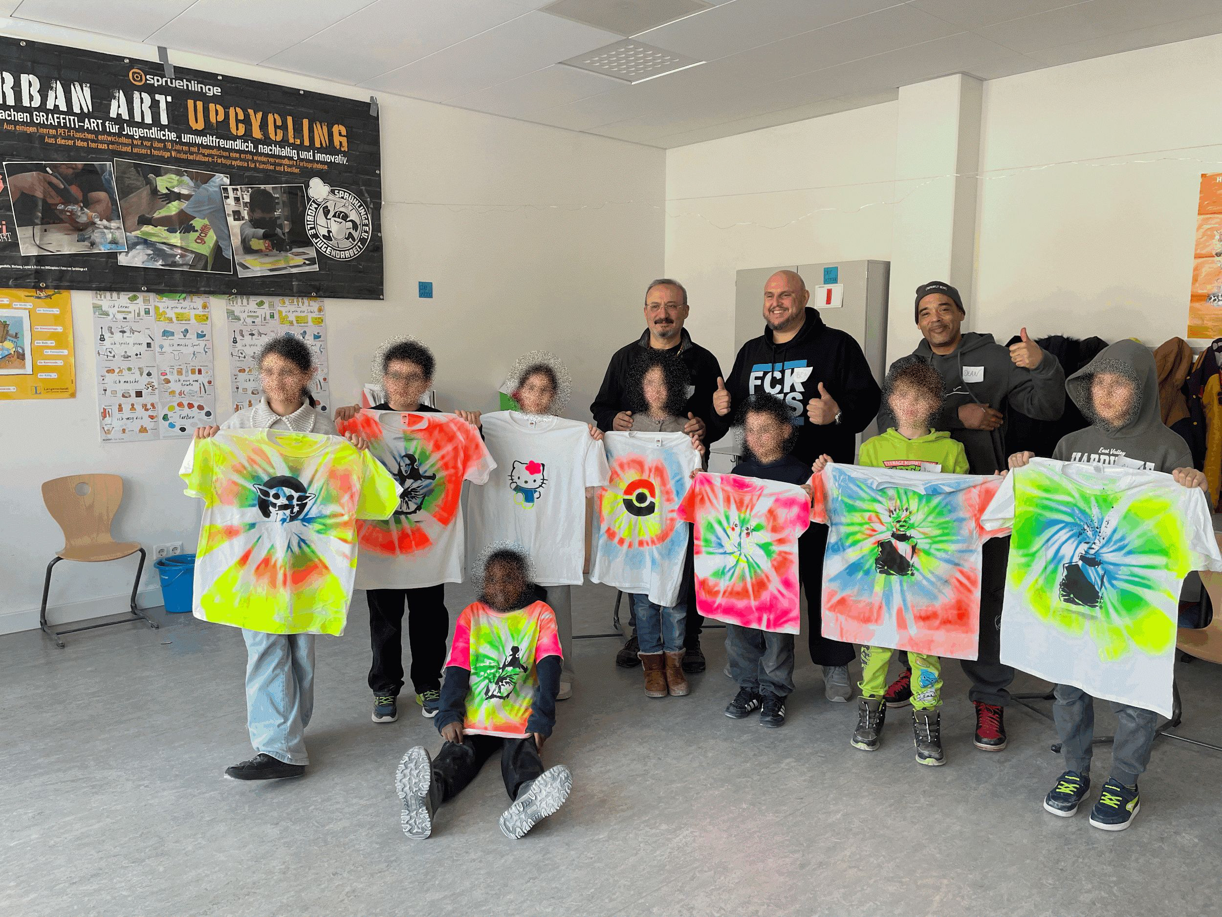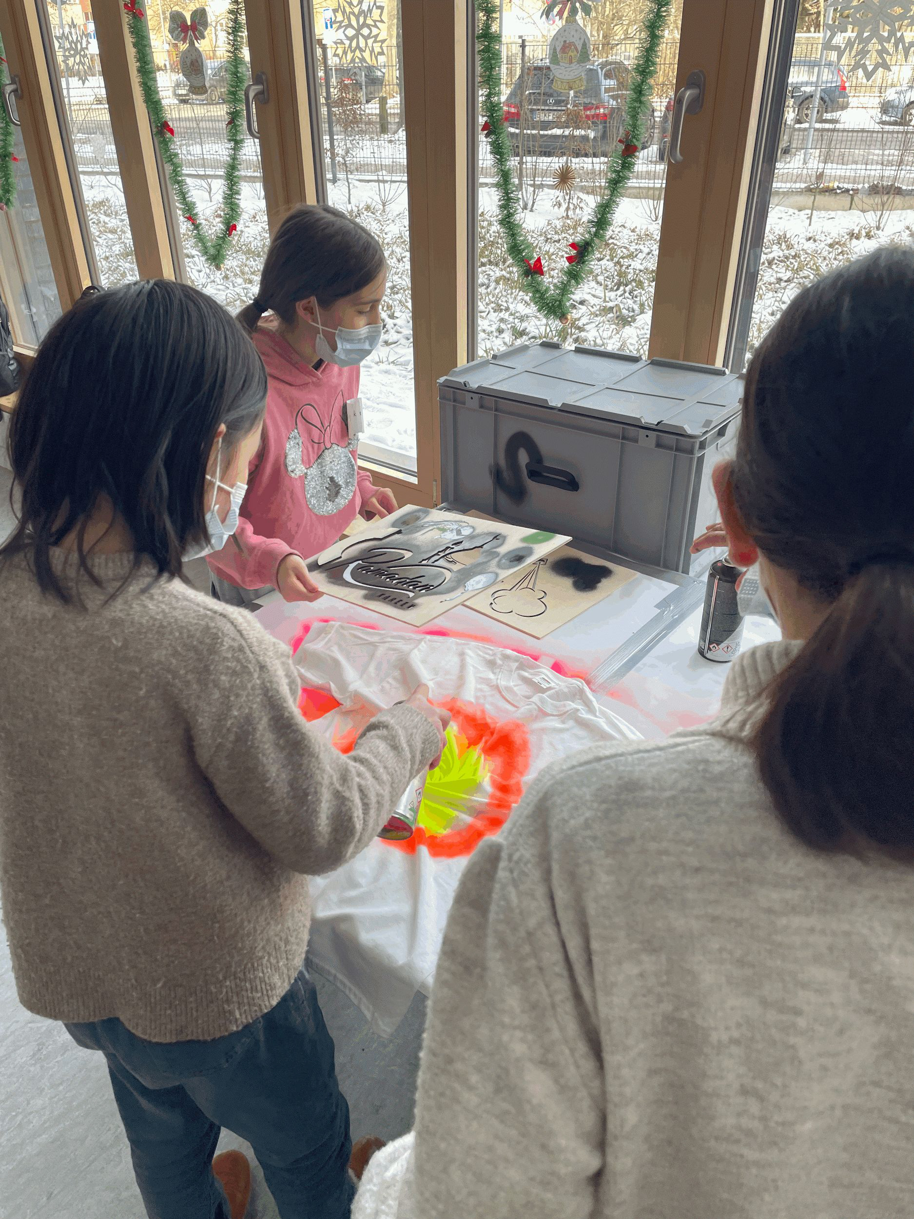 Dabei lernen die Kids nicht nur einige Basics im Hip-Hop-Tanz, sondern auch den richtigen Umgang mit Spraydosen und erfahren einiges über Graffiti als künstlerische Ausdrucksform. Mit Hilfe von gelaserten Schablonen konnten kreativ erste T-Shirts hergestellt werden. Nach den ersten Erfahrungen damit ging’s in der zweiten Runde mit Akrylstiften und Leinwänden weiter. Die gestalteten Bilder zu den Themen Empowerment, Zusammenhalt und gegen Rassismus werden zum Frühlingsfest in der Schule ausgestellt.